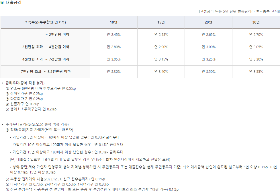 ▪ 대출대상 : 부부합산 연 소득 5천만원 이하, 순자산가액 3.61억원 이하 무주택 세대주, 신혼부부(혼인기간 7년이내 또는 3개월이내 결혼예정자)